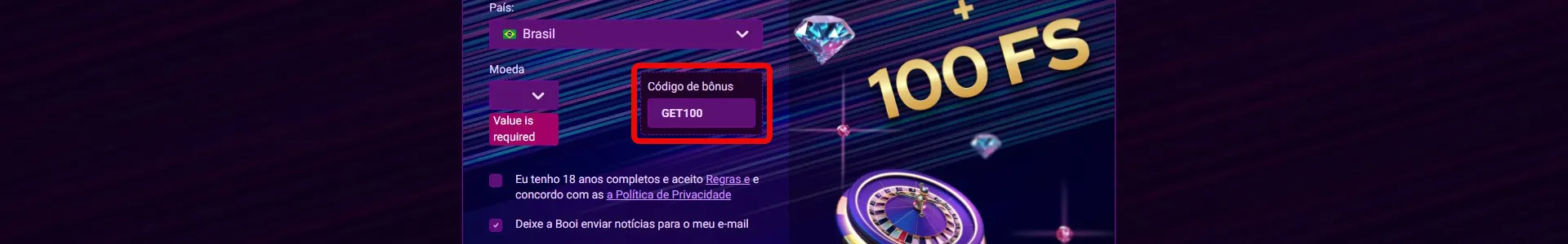 Obrigatoriamente, insira GET100 no campo “Código de bônus”. Se isso não for feito, você perderá o direito de receber o bônus.