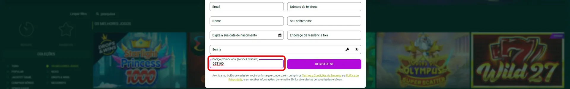 Clicando no botão “Registro”, preencha completamente o formulário com seus dados reais. Insera obrigatoriamente o código promocional GET100 no campo correspondente. Se isso não for feito, o bônus não será creditado. Passo 3